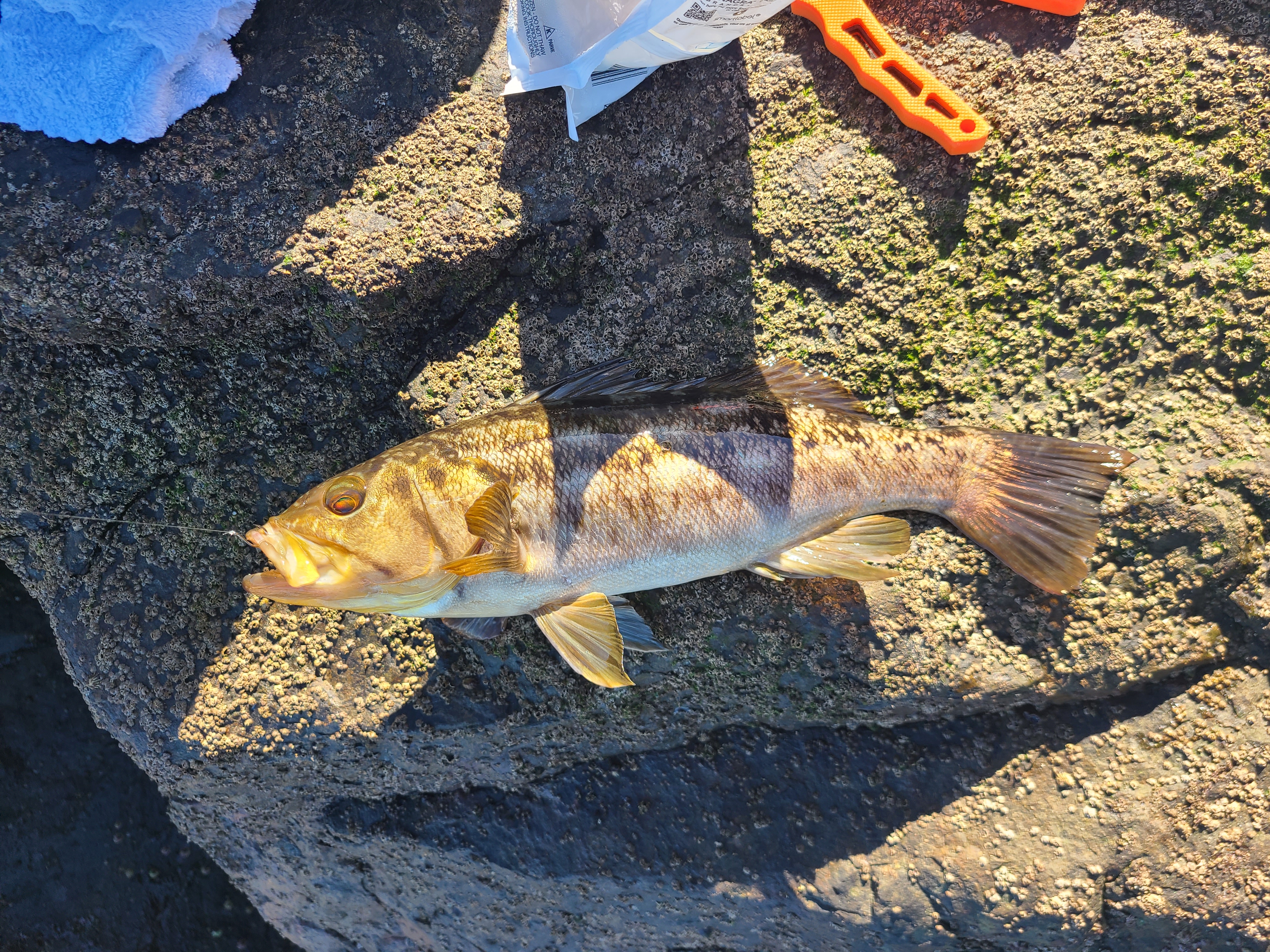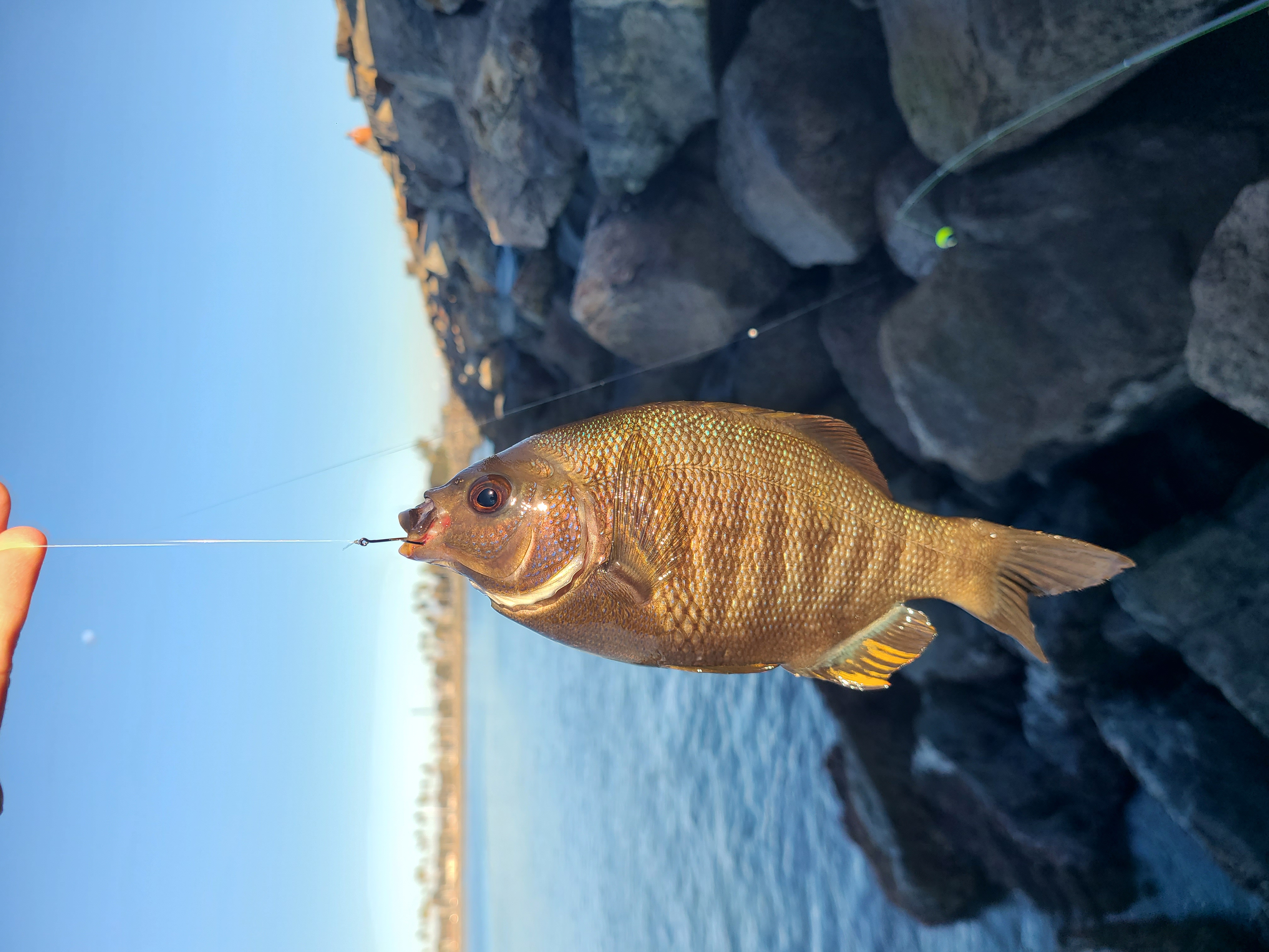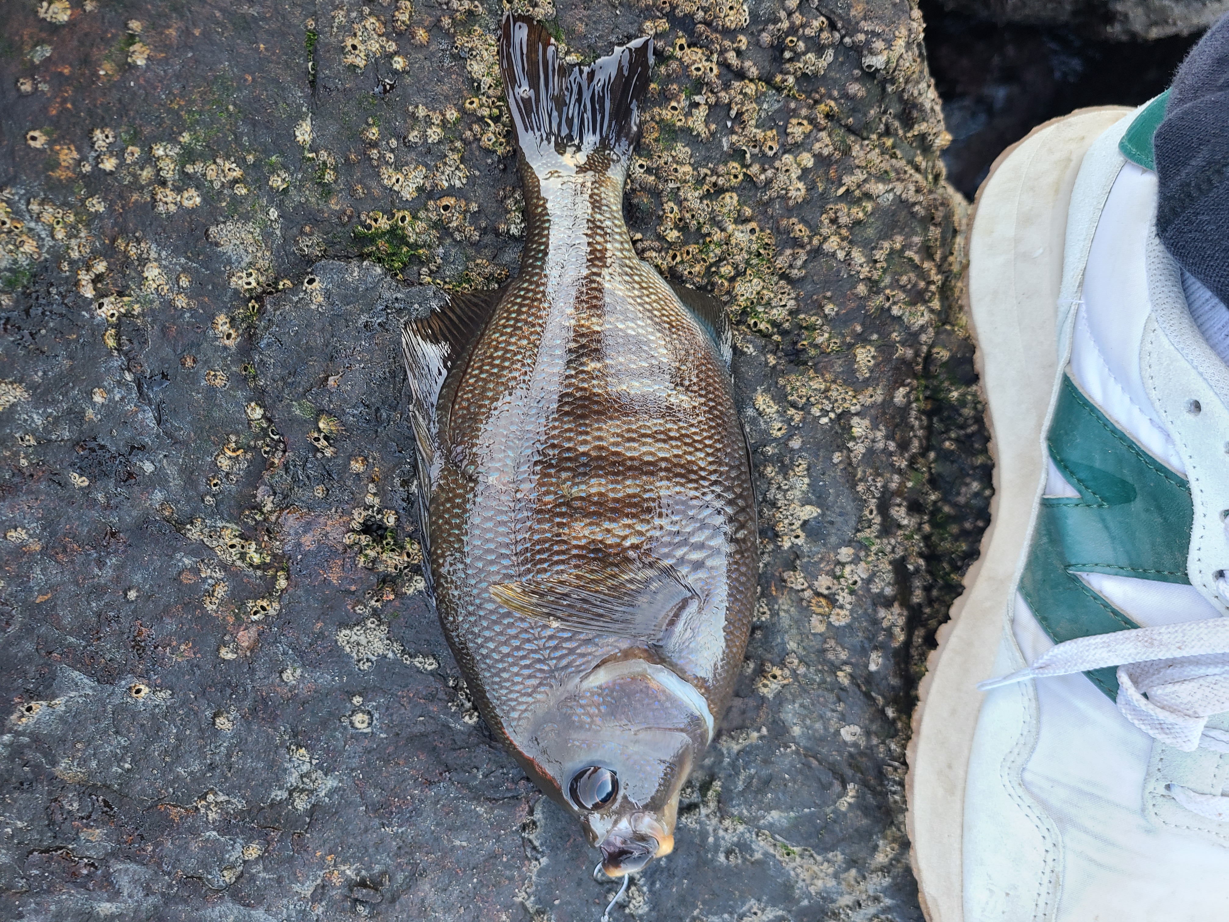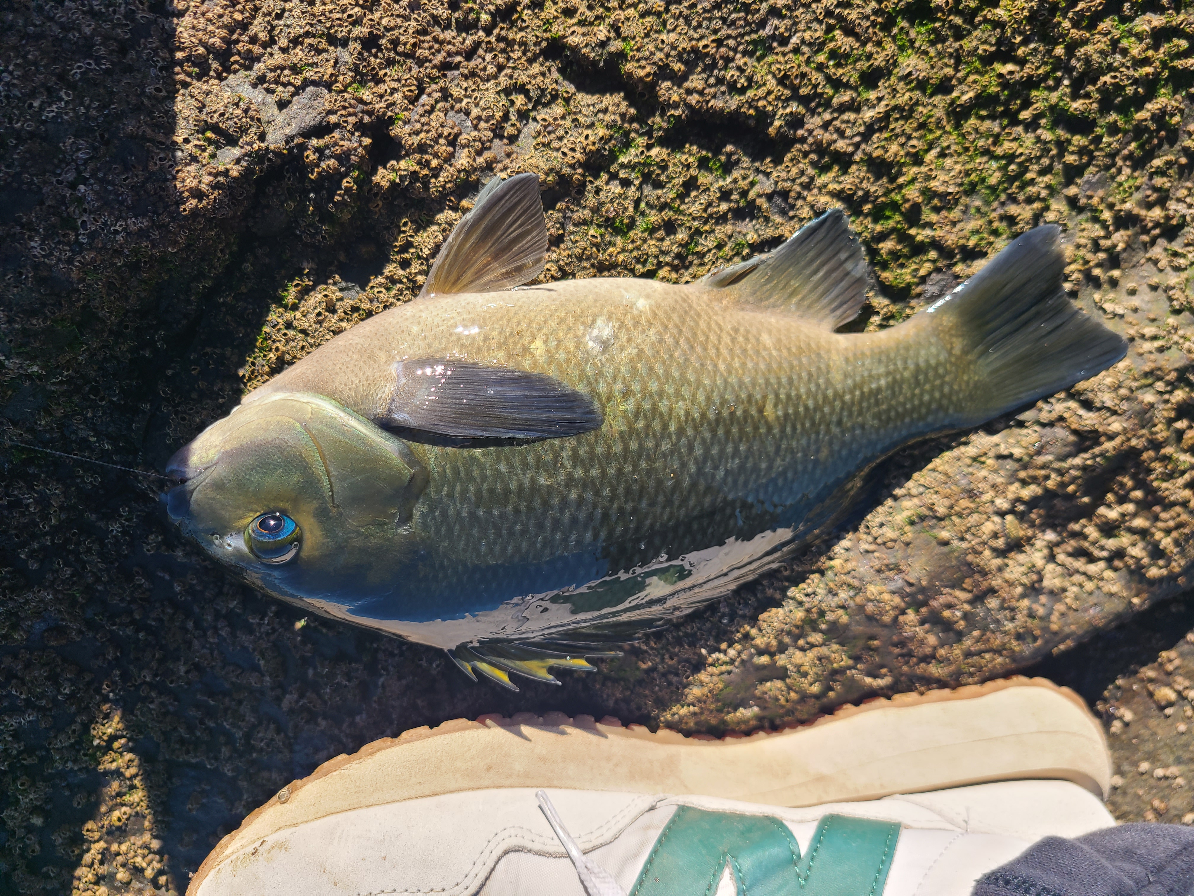 채비는 딱 하나 0.8호 반유동. 미끼는 완두콩 하고 새우를 조각조각 내서 잘라서 왔다. 완두콩으로 낚시 시작. 첫 수는 30cm 짜리 빵 좋은 벵에돔! 이날은 총 세 마리의 벵에돔을 잡았는데, 두 마리는 방생하고 마지막에 잡은 32cm 벵에돔만 킵. For bait, I brought peas and cut up shrimp. I started fishing with peas. The first catch was a 30cm beautiful Opaleye! I caught a total of three Opaleye that day—released two and kept the last one, a 32cm Opaleye.