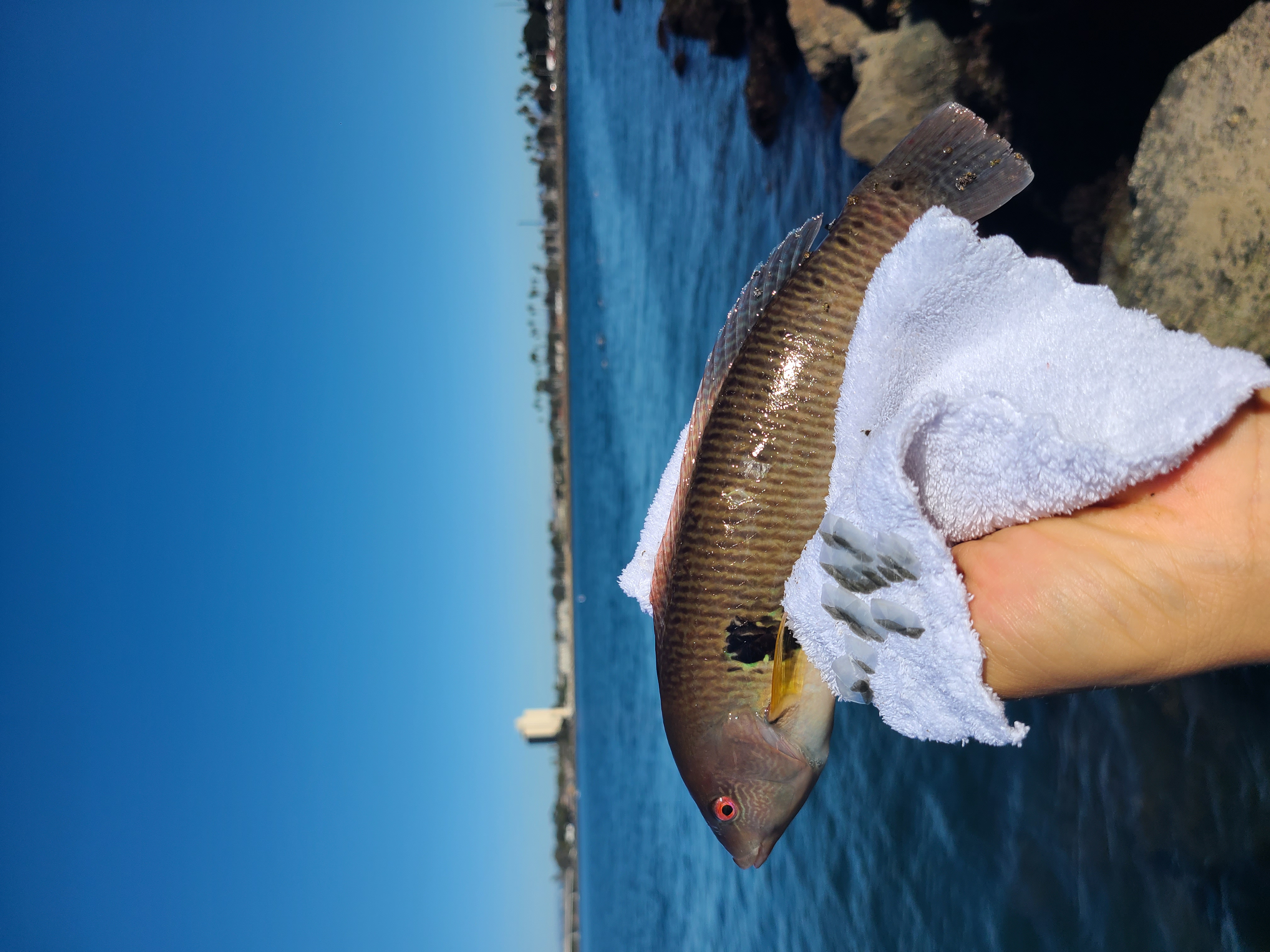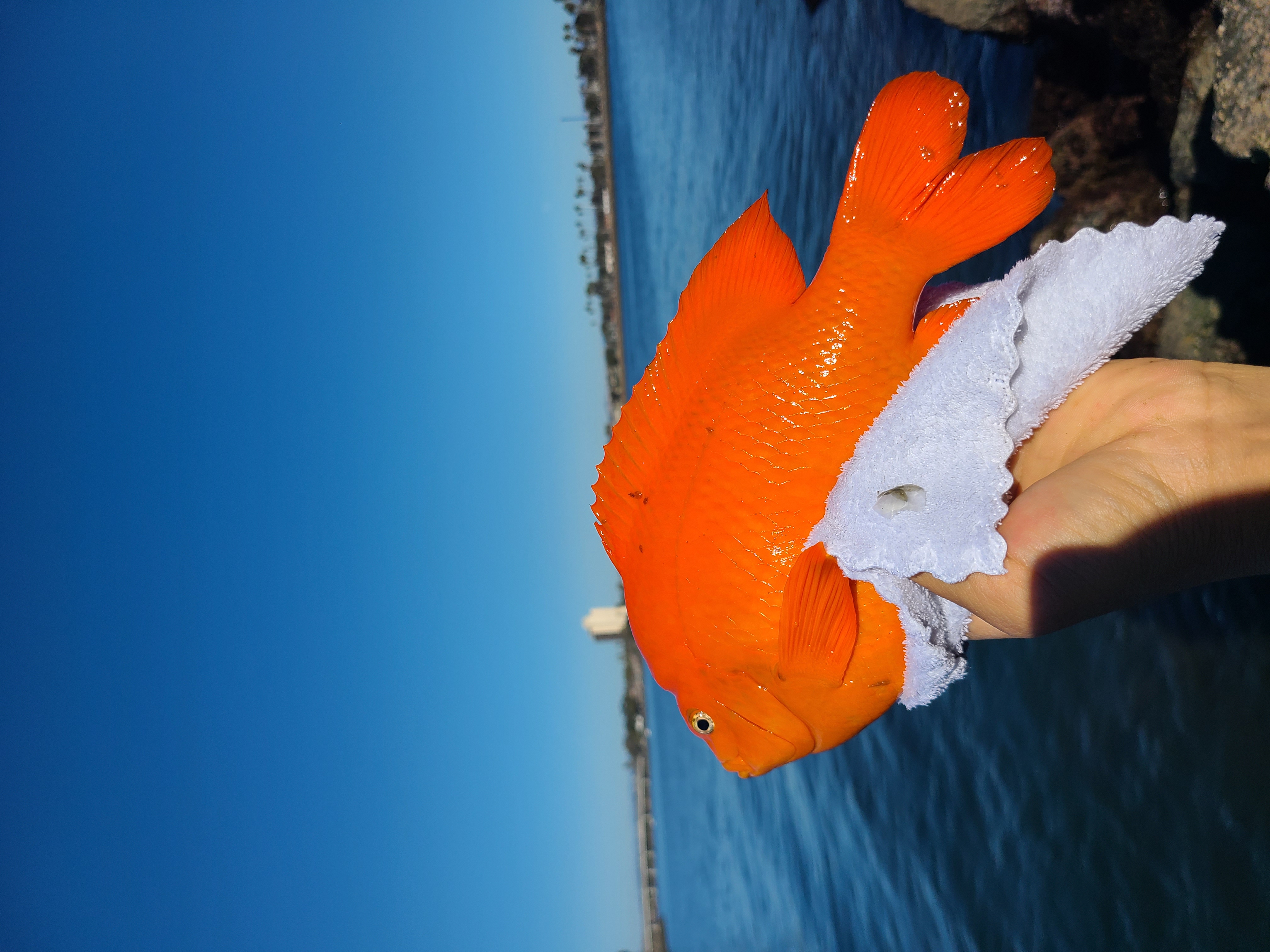 처음 잡아보는 물고기 두 마리: 놀래기와 가리발디. 놀래기는 처음 잡아보는 거라 법을 알지 못해서 그냥 방생. 오렌지 색 가리발디는 빵이 좋았다. 가리발디는 잡는 게 금지돼 있는 물고긴데, 이렇게 얼떨결에 올라오는 건 살려주면 된다. 벌금 내기 싫어서 방생ㅋㅋ Two fish I caught for the first time: a rock wrasse and a garibaldi. Since it was my first time catching a rock wrasse, I wasn’t familiar with the regulations, so I released it. The fine for keeping a Garibaldi fish in California can be very pricey upto $1000? (not sure the exact amount of the fines). If you accidentally hook a Garibaldi, you should release it unharmed as soon as possible. I released it right away after the photo was taken.🤣😅