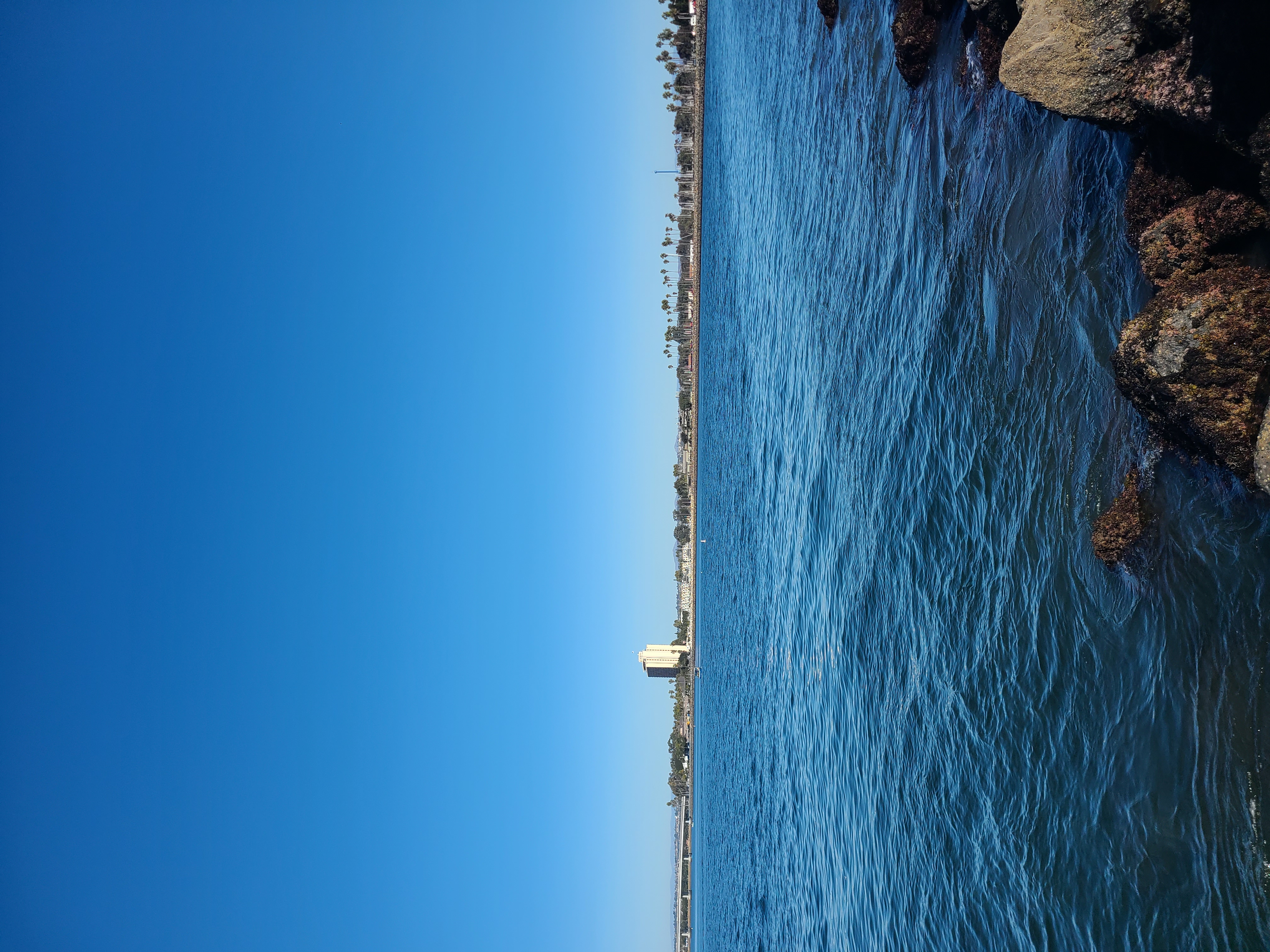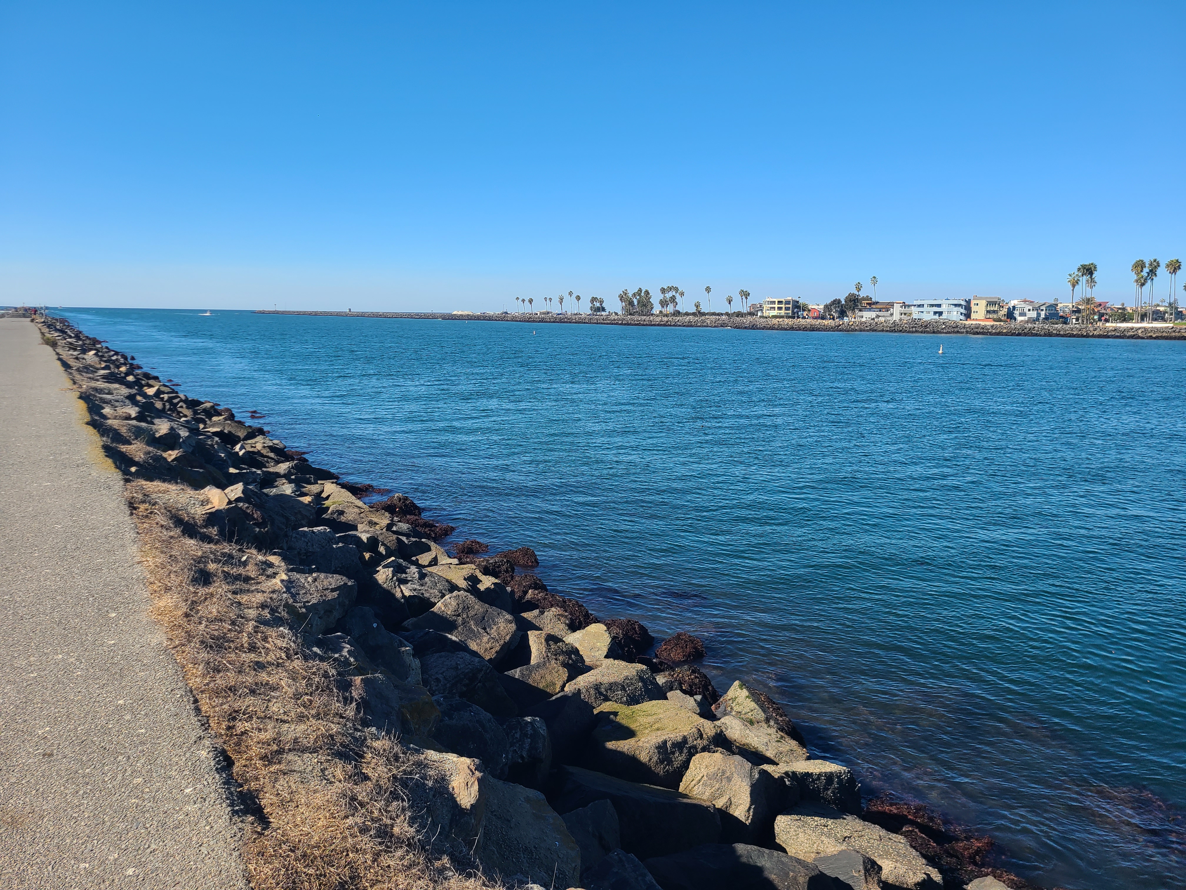 오늘의 장소는 낚시하기 편한 Jetty. Quivira 방파제. 보통 다른 조사님들은 방파제를 따라 끝까지 나가서 하지만 나는 그냥 대충 걸어가다 중간에서 서있기 편한 돌이 보이면 멈춰서 시작. 끝까지 걸어가기 귀찮은 것도 있다 😂ㅋㅋㅋ 방파제 사진을 보면 방파제 앞쪽으로 물띠가 보이는데, 수로 중간에 들어오는 본류랑 방파제 주변 지류가 있는 것 같다. 멀리 캐스팅할 필요는 없고 보통 방파제 주변 앞 쪽에서 고기가 잘 잡힌다. Today's location is a fishing-friendly jetty, Quivira Jetty. While most anglers walk to the end, I usually stop midway when I find a comfortable rock to stand on. Walking to the end feels too tiresome.