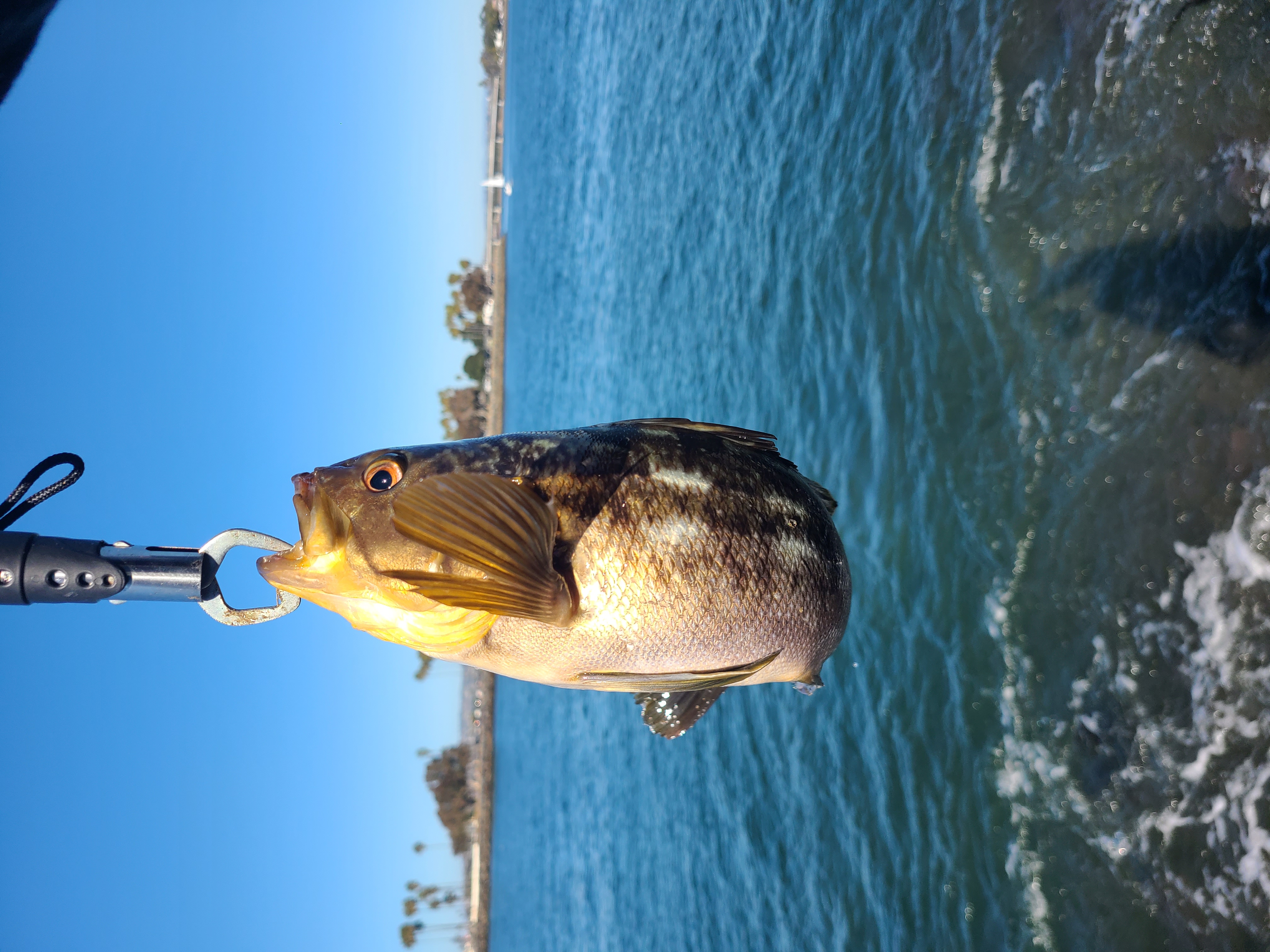 두 번째는 조과는 금지체장 넘는 칼리코배스! 15인치였으니까, 4짜 조금 모지라는 38cm. 낚시 내내 손바닥만 한 칼리코배스가 많이 올라왔다. The second catch was a calico bass, which was over the legal size limit! It measured 15 inches, just shy of 40cm. Throughout the day, I caught many small calico bass, about the size of my palm.